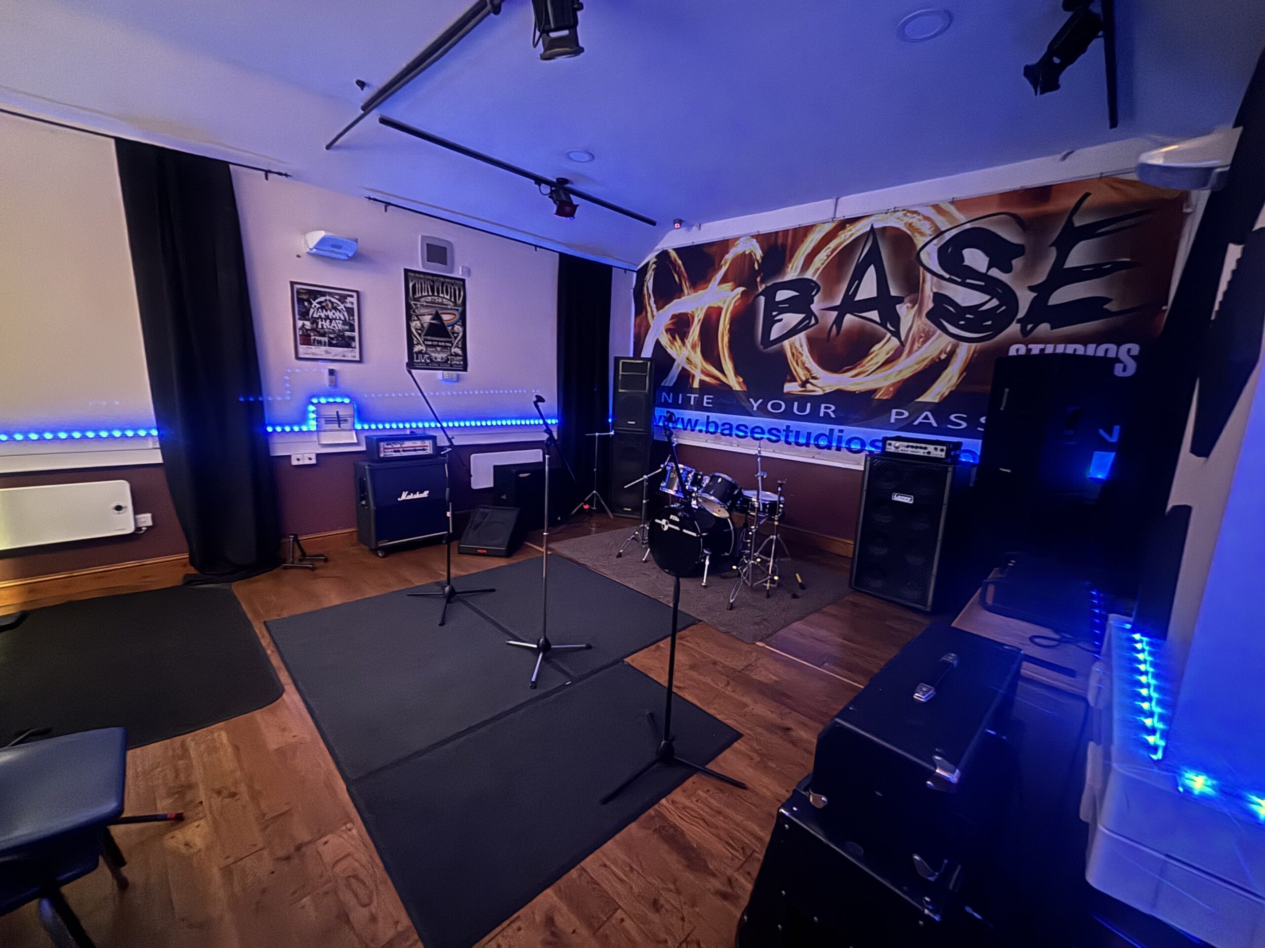 This room can be used to mimic conditions in smaller gigs and has been used for video shoots recreating a show in a small club environment. Studio 4 has a quadrant corner stage which can also serve as a drum riser while the rest of band makes use of the ample space in this room.
